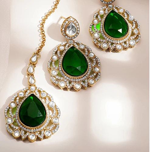 This jewellery set is stunning with vibrant green gemstones and sparkling crystals. The elegant design feels luxurious and eye catching, perfect for weddings, parties, and festive celebrations.