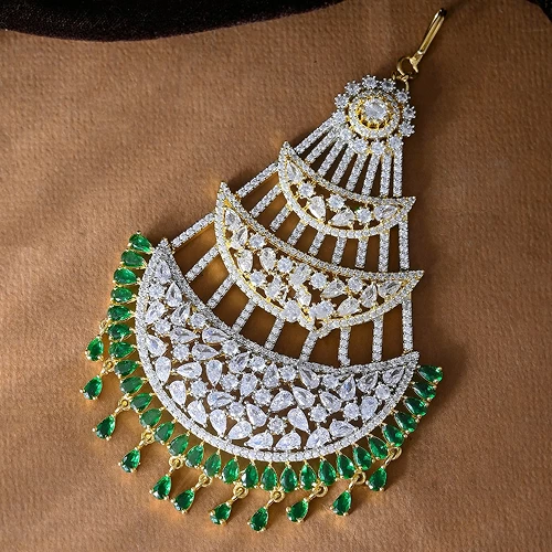 This maang tikka is breathtaking with sparkling crystals and vibrant green stones. The intricate layered design feels luxurious and elegant, perfect for festive occasions and statement jewellery lovers.
