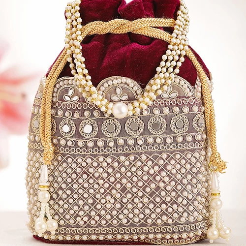 This bridal potli bag looks stunning with intricate embroidery, pearls, and elegant detailing. It feels luxurious and traditional, making it perfect for weddings, festive occasions, and ethnic outfits.