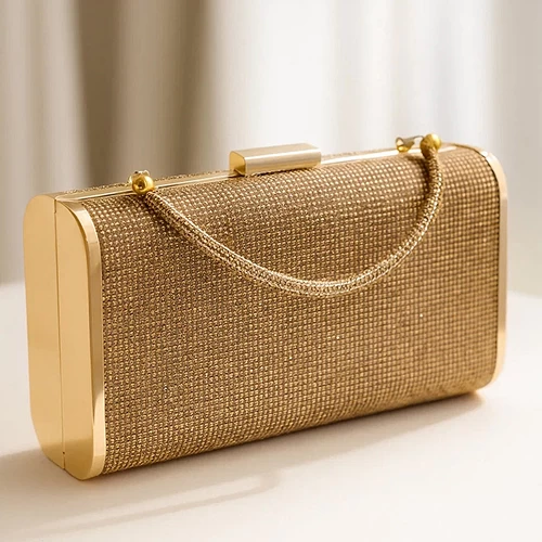 This elegant gold clutch bag looks luxurious and stylish. Its sleek design and shimmering finish make it perfect for weddings, parties, and special evening occasions.
