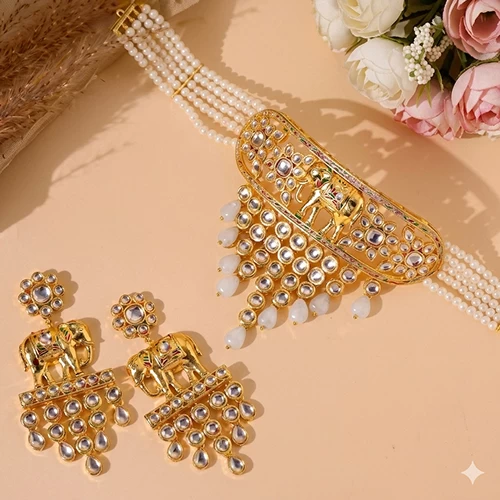 These choker necklace are vibrant and beautifully crafted with pink enamel and pearl drops. The design feels festive, elegant, and perfect for weddings, celebrations, and traditional outfits.