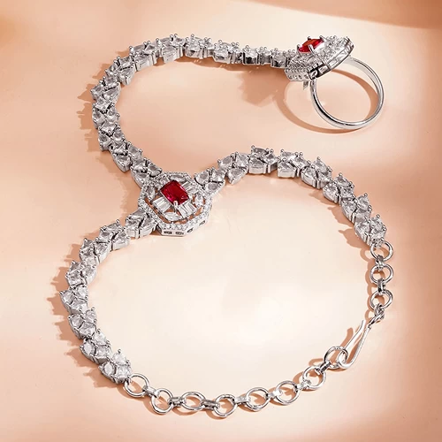 This Haathphool looks stunning with sparkling crystals and vibrant red stones. The design feels luxurious and eye-catching, perfect for parties, weddings, and special occasions.