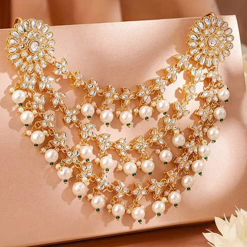 This necklace set is stunning with delicate floral patterns and pearl drops. The craftsmanship feels luxurious and elegant, making it perfect for weddings, festive celebrations, and special occasions.