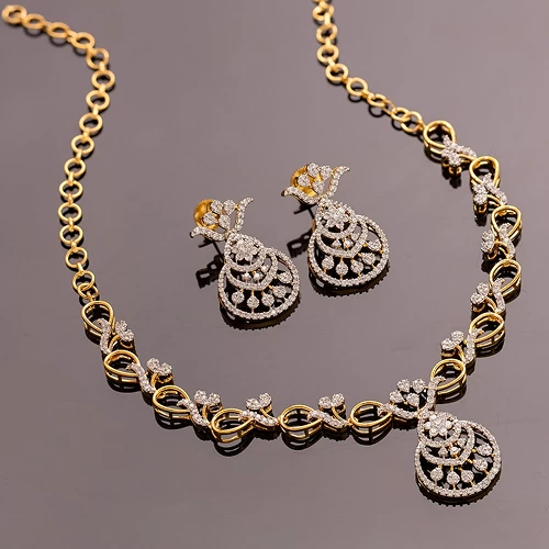 This necklace and earring set looks elegant with sparkling stones and intricate design. The craftsmanship feels luxurious, making it perfect for parties, weddings, and special occasions.